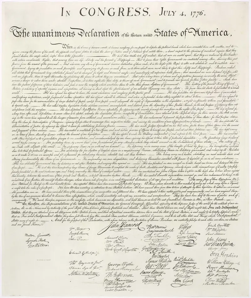 1776년 7월 4일, 대륙회의(Continental Congress)는 영국으로부터의 독립을 선언하는 독립선언문을 채택하였다. 이후 독립전쟁(1775–1783)을 거쳐 미국은 주권 국가로 출범하였으며, 1787년 현행 헌법이 제정되어 연방 공화국의 기틀을 마련하였다.