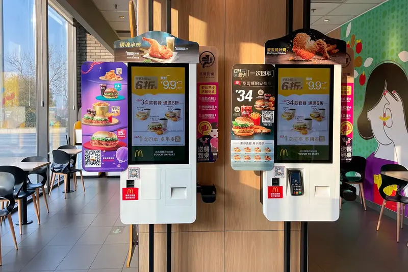 외식 업계 도입은 상대적으로 늦었다. 2010년대 후반 패스트푸드 프랜차이즈가 무인 주문기를 시범 도입했고, 코로나19 확산이 본격화된 2020년 이후 비대면 수요가 폭발적으로 늘면서 음식점 키오스크 도입이 급증했다.[5] 업종별로는 피자·햄버거·샌드위치 유사 업종(23.6%), 간이 음식 포장 판매 전문점(20.2%), 기관 구내식당(14.7%) 순으로 사용 비중이 높다. 국내에 보급된 키오스크 총 대수는 2024년 기준 약 45만 대로 추산된다.[2]
